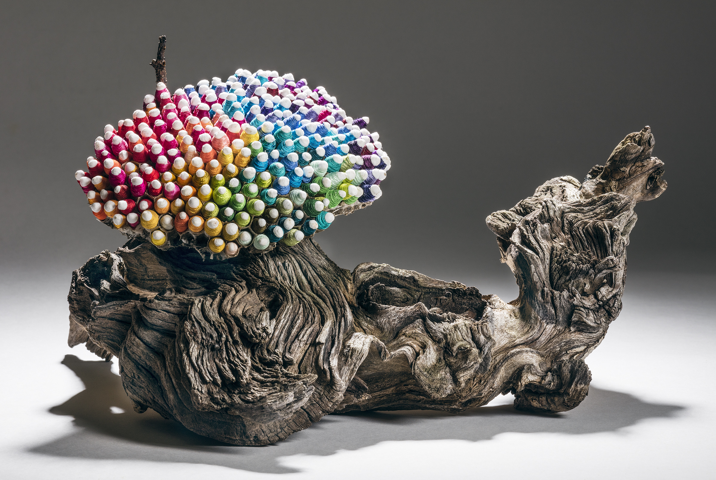 ← Bundled, wasp nest-cotton-hand dyed silk thread- wasp-drftwood, 6″x12″x12″ Inv#S1437
